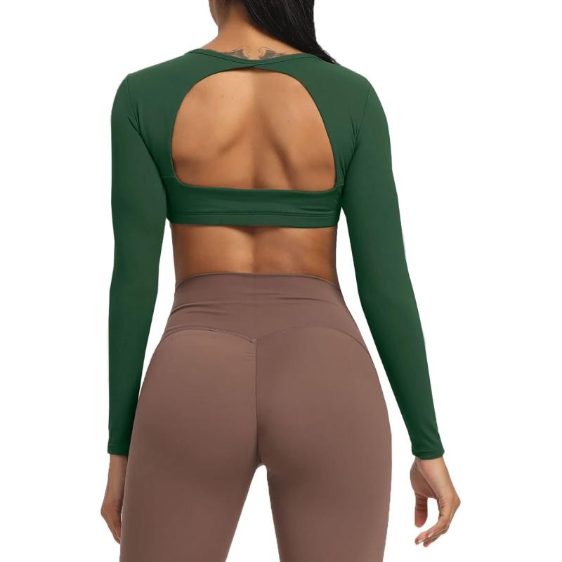 Aoxjox Long Sleeve Crop Tops for Women Clarissa Backless Workout Crop T Shirt TopStorm Green