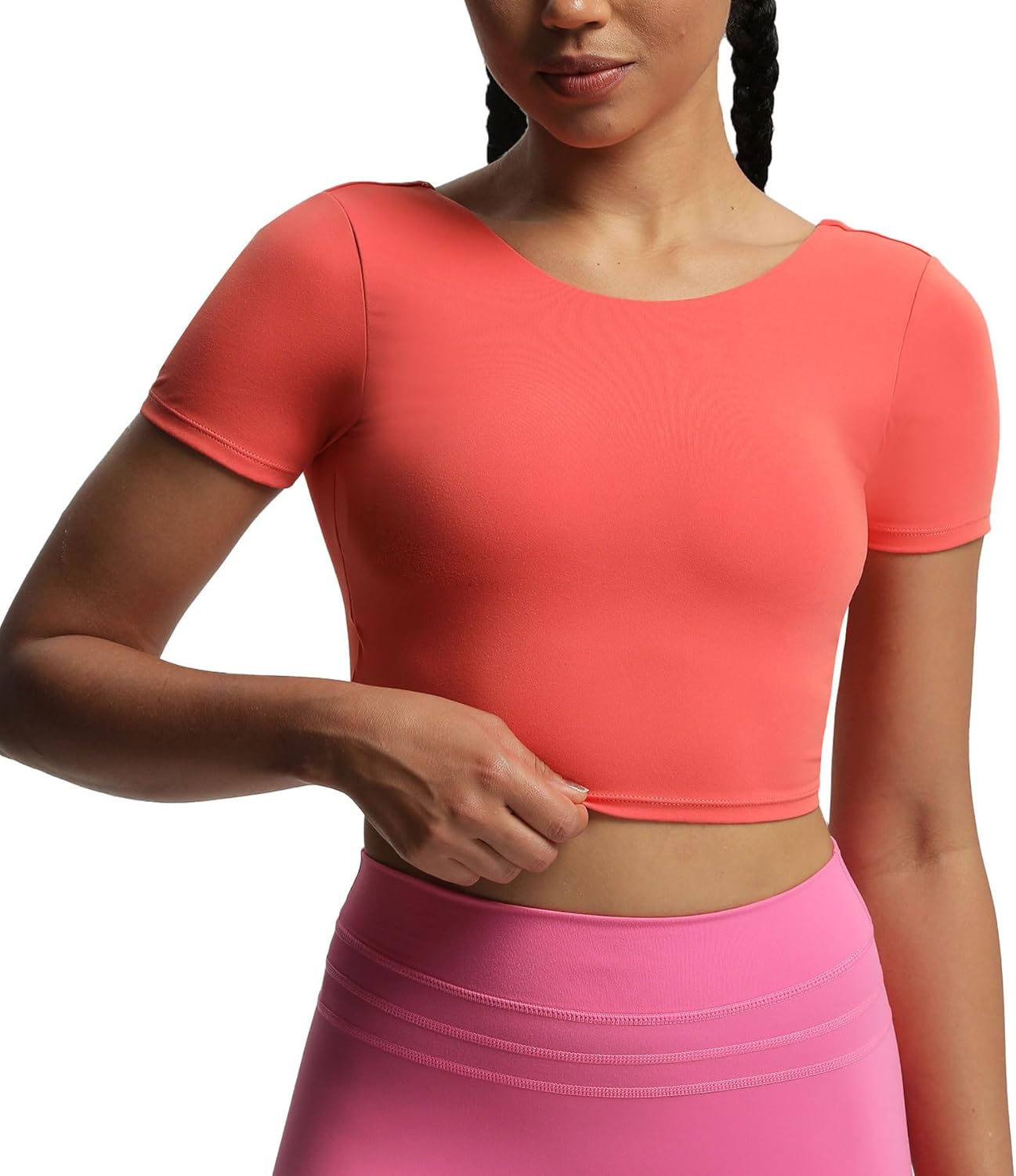 Aoxjox Short Sleeve Crop Tops for Women Emma Backless Twist Back Workout Crop T Shirt Top(Spiced Coral)