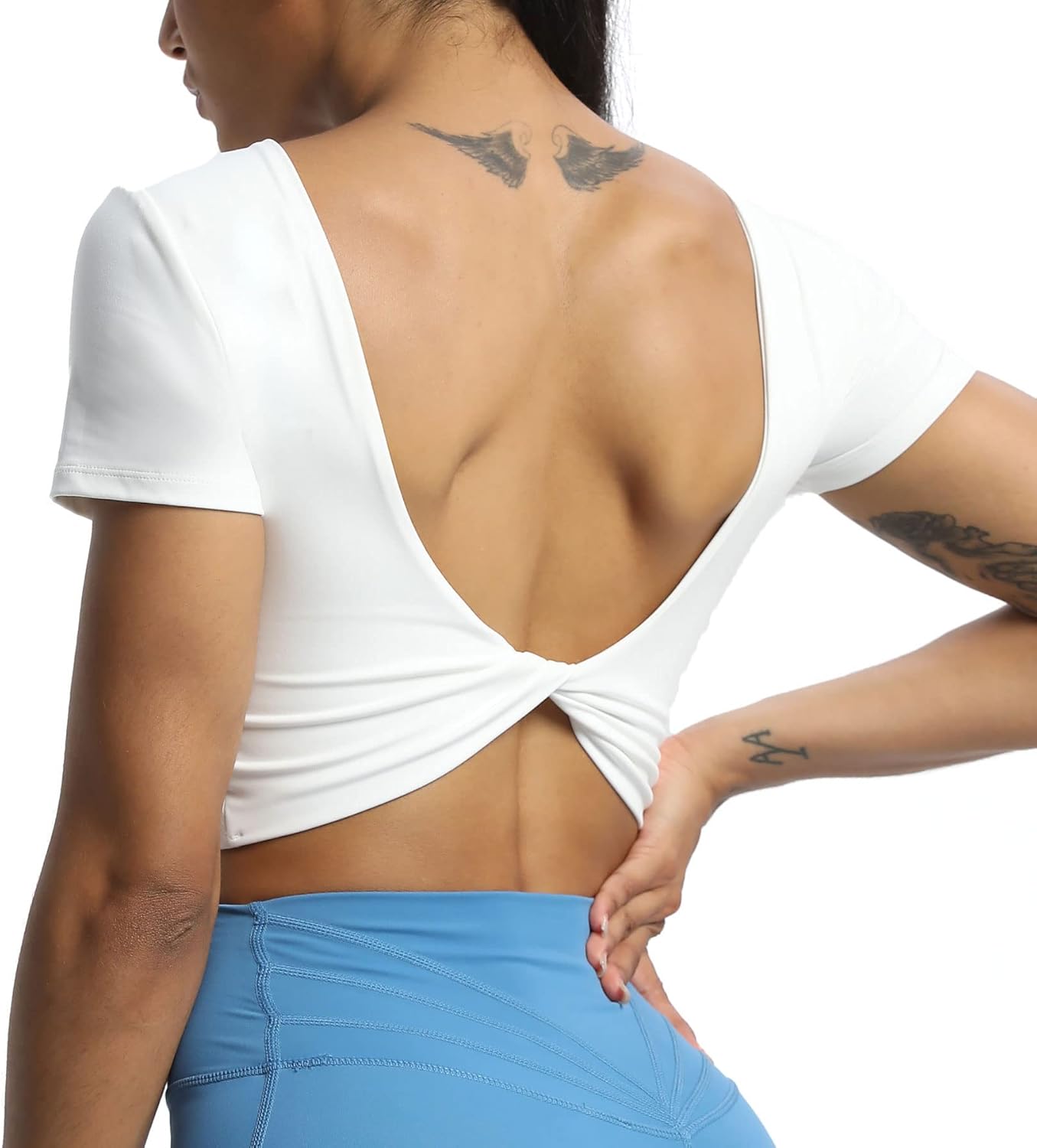 Aoxjox Short Sleeve Crop Tops for Women Emma Backless Twist Back Workout Crop T Shirt TopWhite