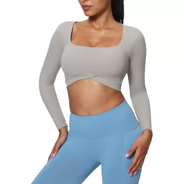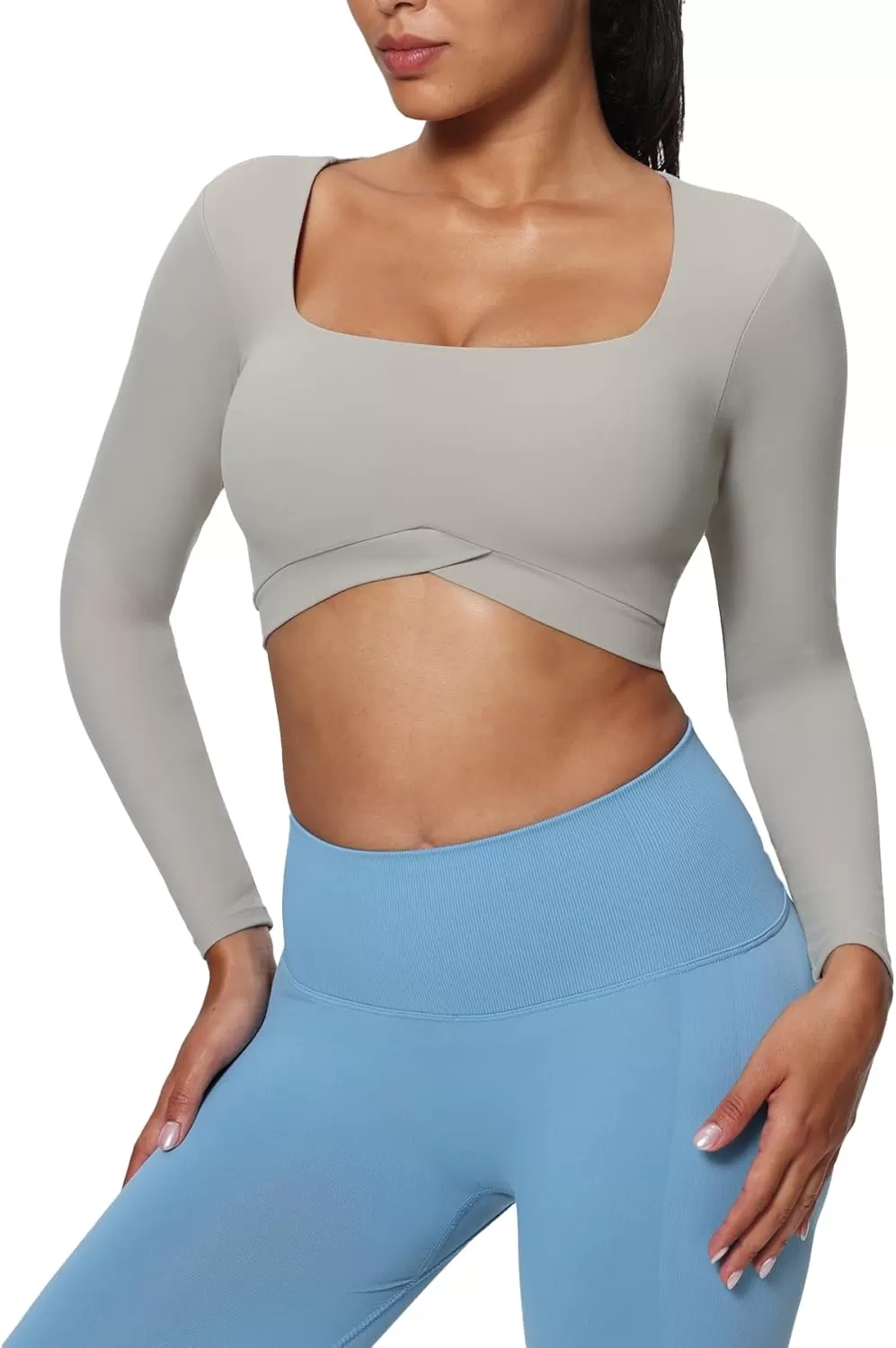 Aoxjox Vivie Long Sleeve Crop Top for Women Square Neck Hem Layers Workout Crop T Shirt Top(Mink)