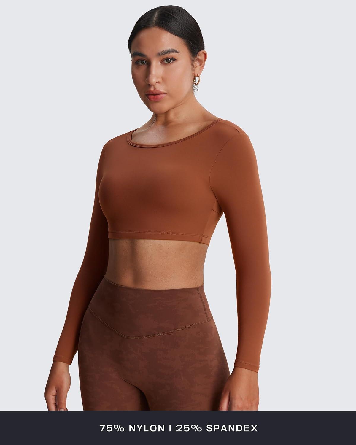 Aoxjox Workout Long Sleeve Crop Tops for Women Clarissa Backless Gym Cropped T Shirt Top(Driftwood)