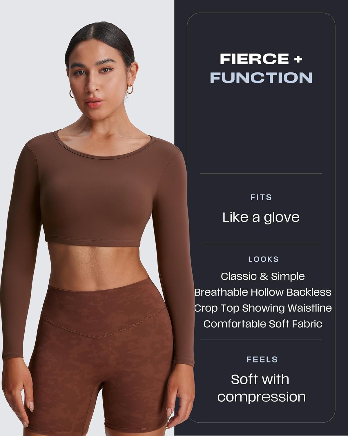 Aoxjox Workout Long Sleeve Crop Tops for Women Clarissa Backless Gym Cropped T Shirt Top(Earthy Brown)